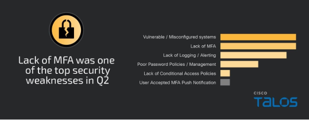 Los sistemas vulnerables o mal configurados y la falta de una implementación adecuada de la autenticación multifactor (MFA, por sus siglas en inglés) empataron en los principales puntos débiles de seguridad observados este trimestre, representando casi todos los compromisos. Talos IR observó un aumento del 46% en cada uno de estos puntos débiles de seguridad con respecto al trimestre anterior.