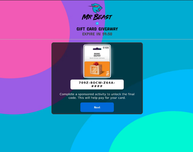 Otro hallazgo de Kaspersky involucró estafas que usaban el nombre de MrBeast —una celebridad de YouTube muy seguida por niños y adolescentes, conocida por regalar premios costosos como gadgets, dinero e incluso casas—. Los delincuentes crearon páginas falsas que prometían “regalos gratis de MrBeast”, como tarjetas digitales para Roblox, Xbox o PlayStation. El sitio pedía a los usuarios elegir un premio y completar una tarea aparentemente inofensiva para obtenerlo. Para generar urgencia, se mostraba un temporizador que animaba a “completar una actividad patrocinada” dentro de un tiempo limitado para desbloquear el código del regalo.