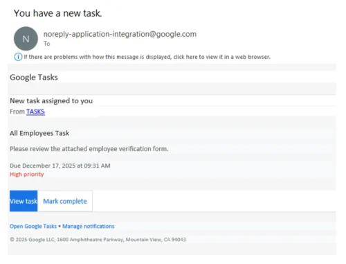 En primer lugar, las víctimas reciben un mensaje aparentemente auténtico. Este correo tiene el asunto “You have a new task” (“Tienes una nueva tarea”). Asimismo, la notificación simula que la empresa implementó Google Tasks como herramienta interna. Por lo tanto, el mensaje genera mucha presión para actuar con rapidez. De hecho, el correo suele incluir indicadores de alta prioridad y plazos muy ajustados.