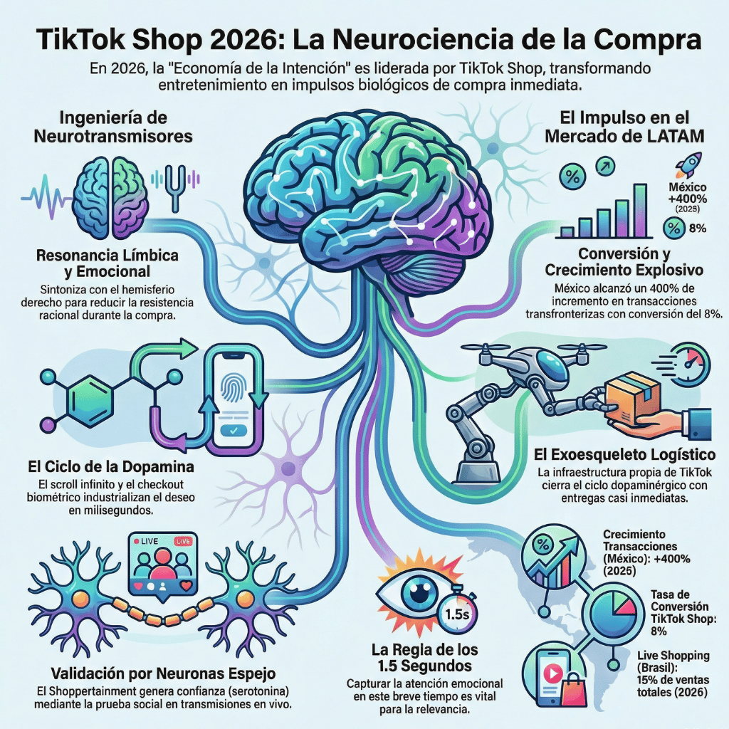 Bajo mi óptica de neuroestrategia, el marketing actual es una sofisticada ingeniería de neurotransmisores. TikTok Shop trasciende el concepto de “tienda” para consolidarse como un ecosistema de resonancia límbica. Su éxito radica en la transición fluida del entretenimiento a la transacción, manteniendo en calma al “guardián racional” del cerebro. Mientras el retail tradicional apela al hemisferio izquierdo (lógico y pausado), TikTok sintoniza con el hemisferio derecho: emocional, impulsivo y profundamente reactivo.