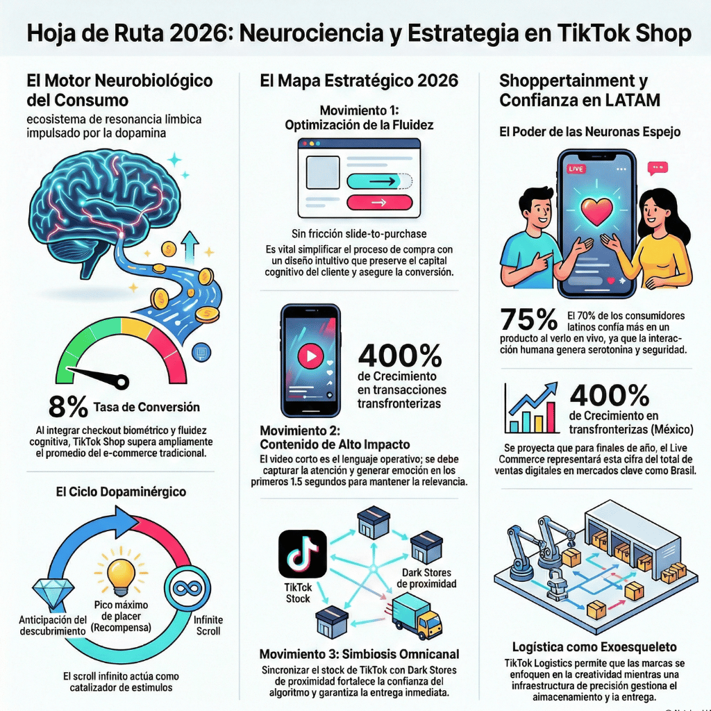 En 2025, TikTok Shop México reportó un incremento del 400% en transacciones transfronterizas. Este hito es el resultado de llevar la fluidez cognitiva a niveles atómicos. Al identificar un interés latente, el algoritmo presenta el producto exacto; en ese microsegundo, el cerebro ya disfruta del placer del descubrimiento. Al integrar el checkoutbiométrico dentro de la misma interfaz, la plataforma fomenta la decisión inmediata. El impulso se convierte en posesión en milisegundos, logrando tasas de conversión del 8%, cifra que supera ampliamente el promedio del e-commerce tradicional. Estamos, positivamente, industrializando el deseo.
