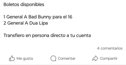 También es importante tener cuidado con publicaciones que ofrecen boletos transferibles, pues para enviarlos los vendedores necesitan tu número de celular o correo electrónico. Esa información puede ser usada para robar tus datos y acceder a tus cuentas, convirtiendo lo que parecía una “oportunidad única” en un fraude.