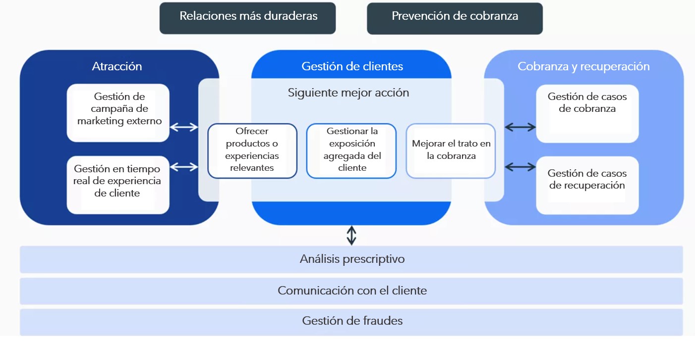 Todo esto comienza con atraer y captar a los clientes adecuados a través de actividades de marketing, y continúa formando una visión integral del cliente a través del riesgo y fraude, y las operaciones de TI.