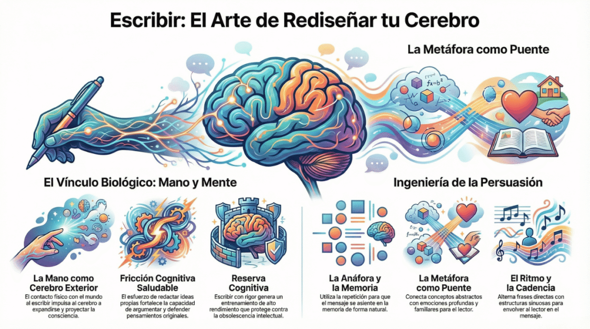 Escribir es producir una obra que se distribuye por el mundo, como la música en un auditorio. El cerebro humano procesa la prosodia: el ritmo, la pausa y la cadencia. Dominar el lenguaje es dominar la forma en que percibimos la realidad. Para ser persuasivo, es clave aplicar la ingeniería psicológica del texto: