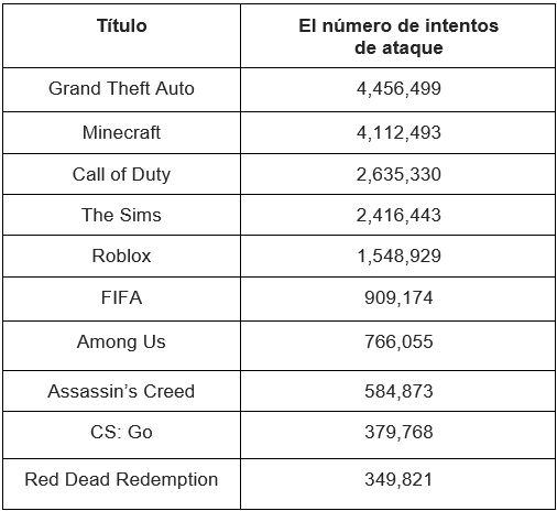 Los 10 juegos populares más vulnerables por la cantidad de intentos de ataque durante el período informado.