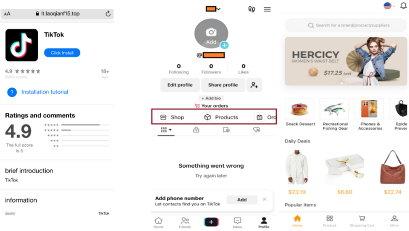 Páginas falsas que imitaban la App Store para instalar una supuesta app de TikTok mediante herramientas de desarrollador, y que también incluían una tienda integrada en la app modificada, la cual sólo aceptaba pagos en criptomonedas.