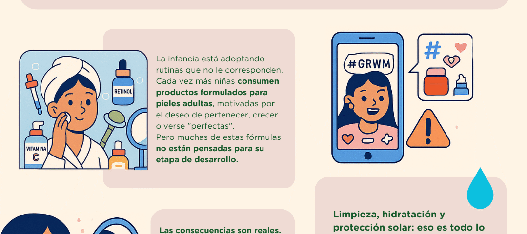 La conversación sobre skincare infantil y adolescente debe dejar de ser una tendencia viral y empezar a ser un debate serio: sobre educación, salud dermatológica, salud mental y también sobre responsabilidad empresarial. ¿Quién está cuidando a estas niñas? ¿Quién les enseña a diferenciar entre lo que quieren y lo que necesitan? ¿Quién les dice que está bien tener granitos, piel grasa o no usar suero de ácido hialurónico de tres fases?