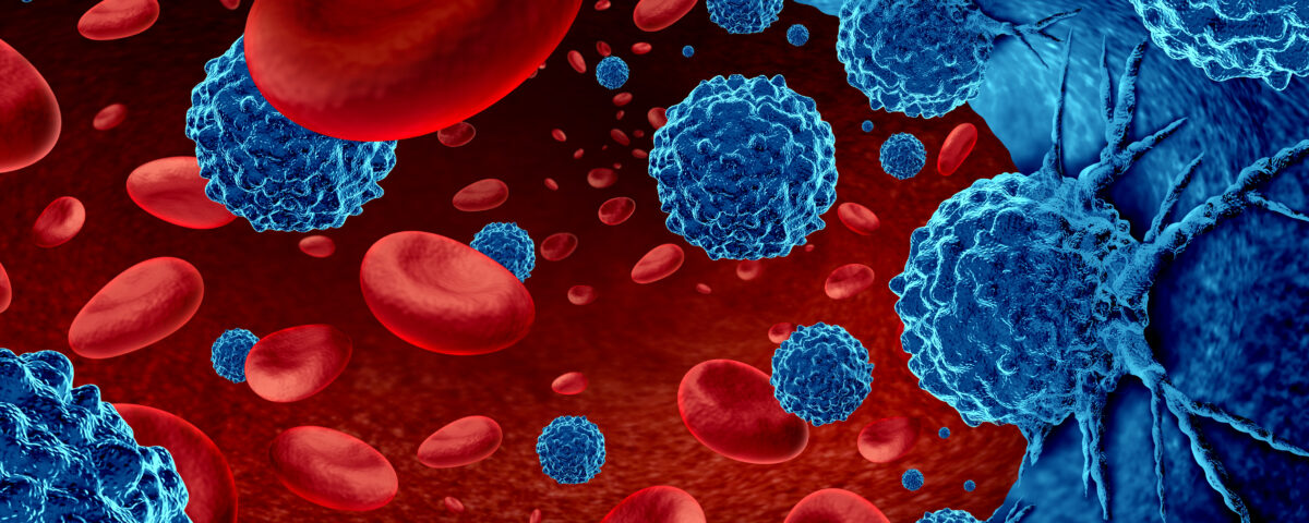 Cancer in the blood outbreak and treatment for malignant cells in a human body caused by carcinogens and genetics with a cancerous cell as an immunotherapy and leukemia or lymphoma symbol and medical therapy as a 3D render.